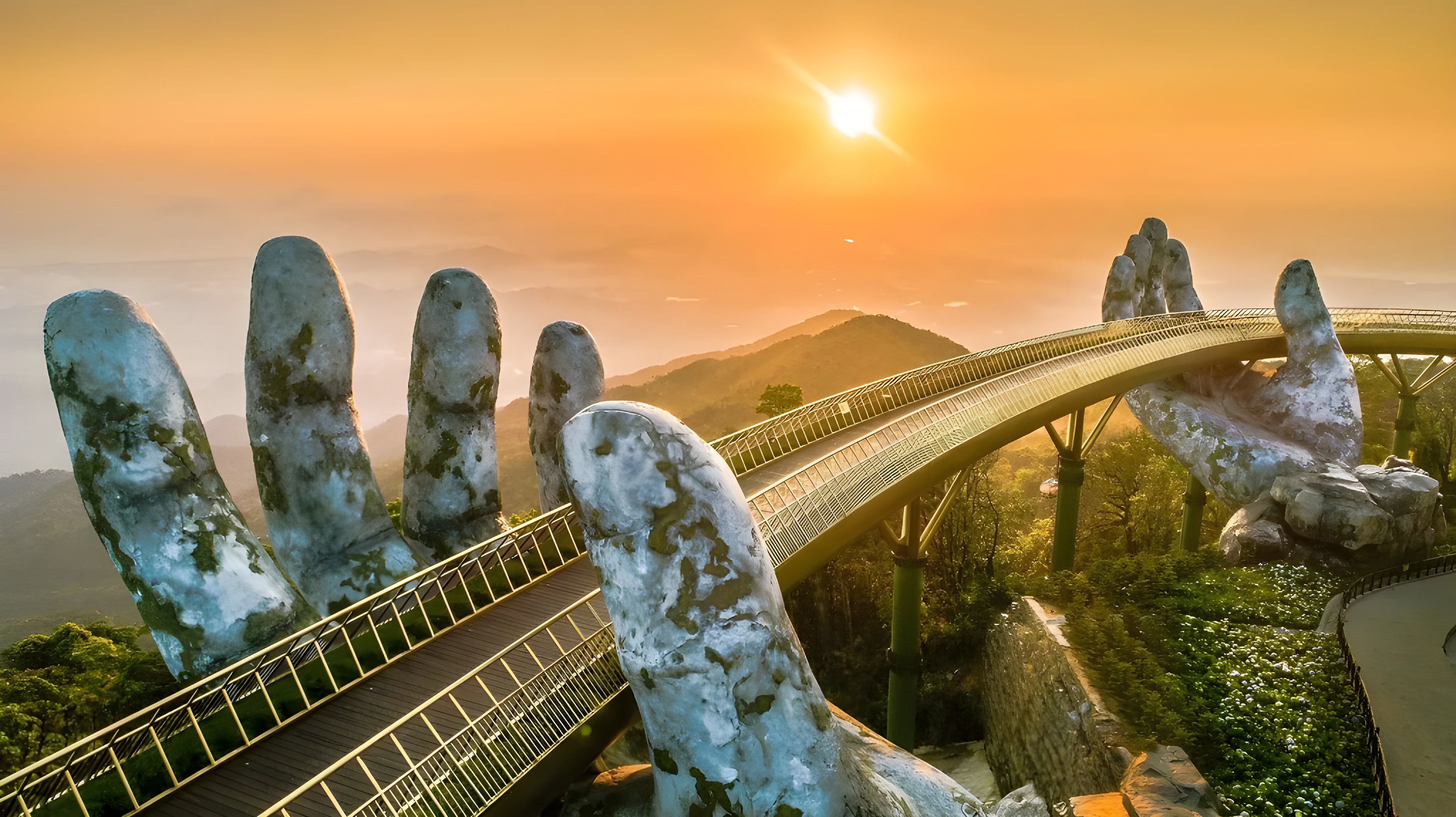 - Walk the iconic Golden Bridge held by giant stone hands.