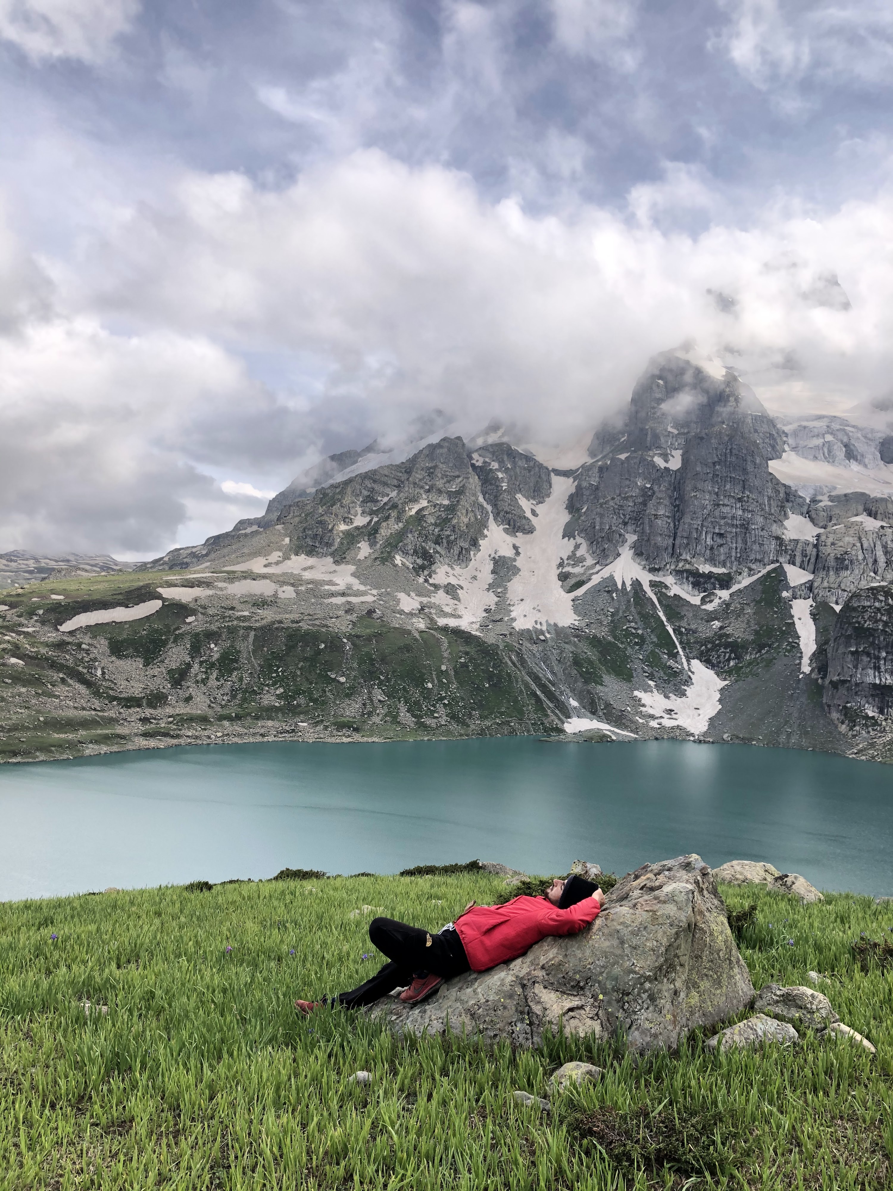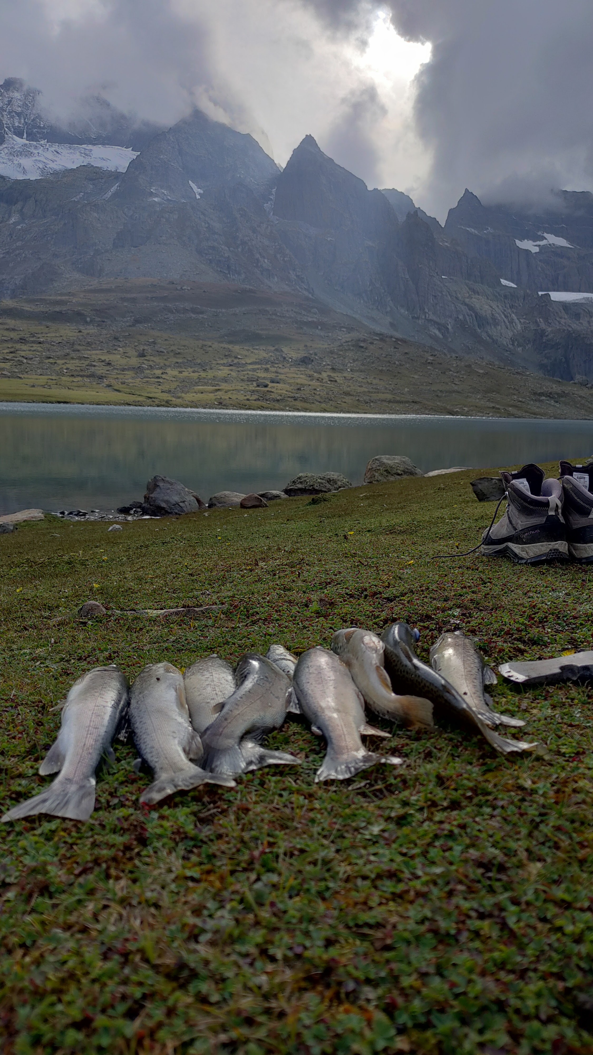 Glacial lake beneath Mount Harmukh; rugged, dramatic vibes; perfect for hardcore trekkers; famous pilgrimage site with trout; visit for a spiritually charged wilderness expedition in a stark alpine setting.