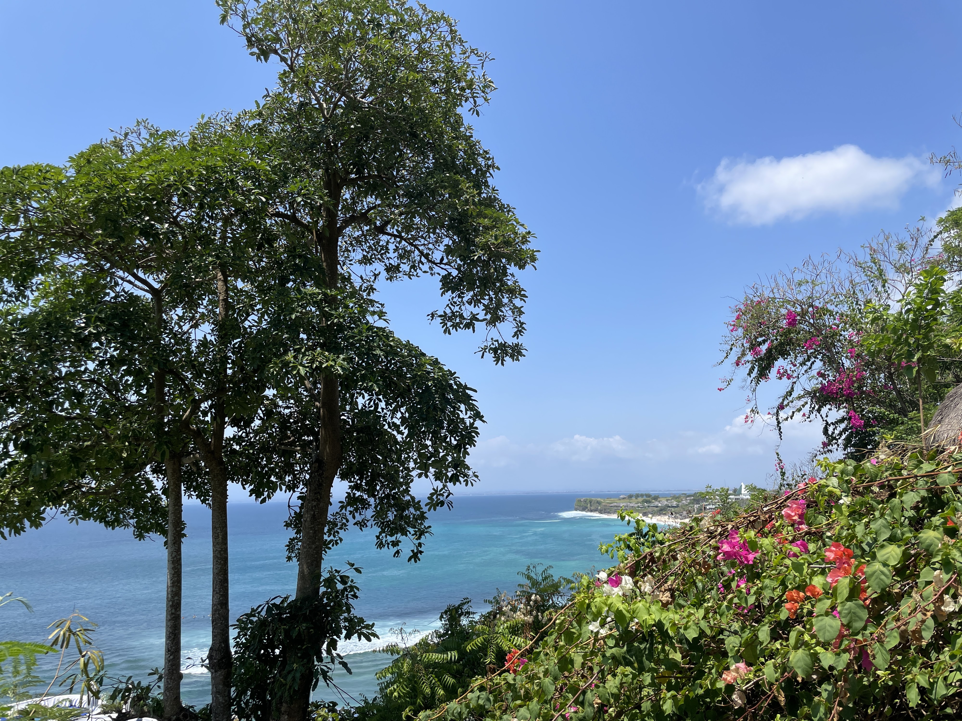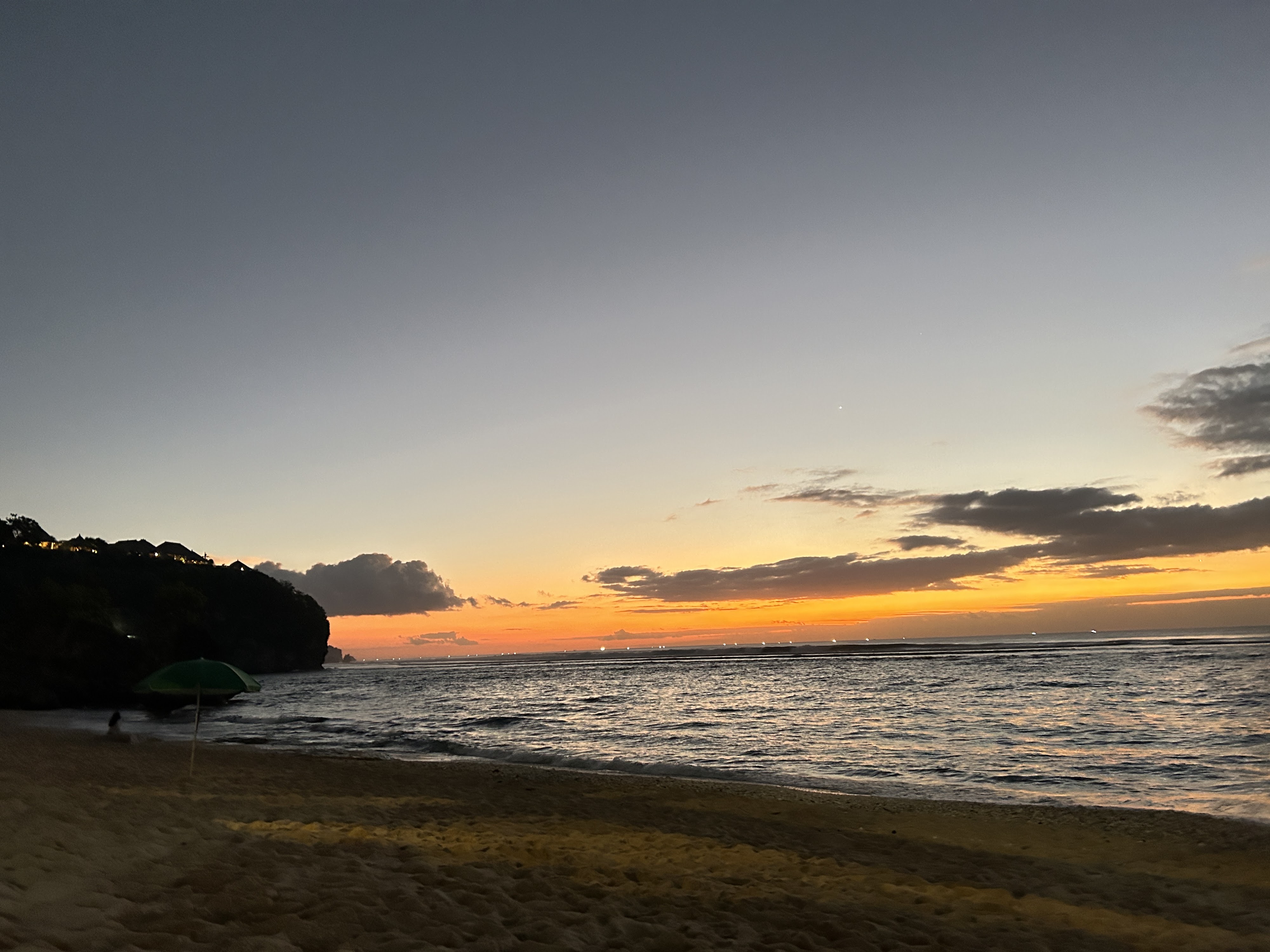 Bingin Beach hides below rugged Bukit cliffs, rewarding the descent with white sand and clean, hollow waves that tempt experienced surfers. Low tide uncovers sapphire tide pools among reef shelves, while cliff-top warungs dish up fresh seafood and chilled coconuts against a dramatic, burnt-orange Indian Ocean sunset.