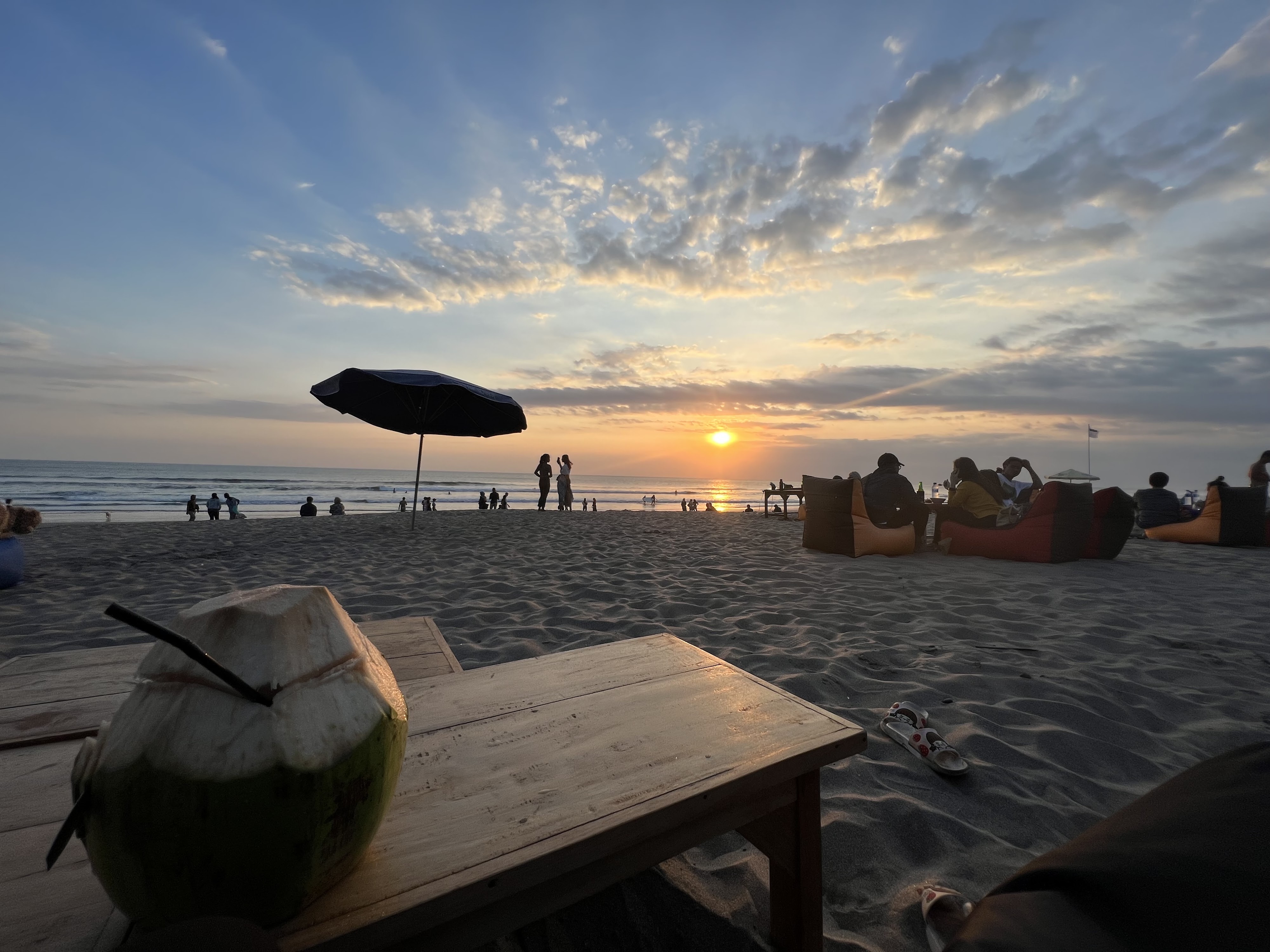 Double Six Beach stretches between Legian and Seminyak with wide tawny sand, steady waist-high surf, and a relaxed day-to-night rhythm. Morning joggers share space with surfing lessons; by late afternoon rainbow beanbags, colourful umbrellas, and chilled lounge beats line the shore as glowing sunsets melt into laid-back fire-dance shows and DJ sets.